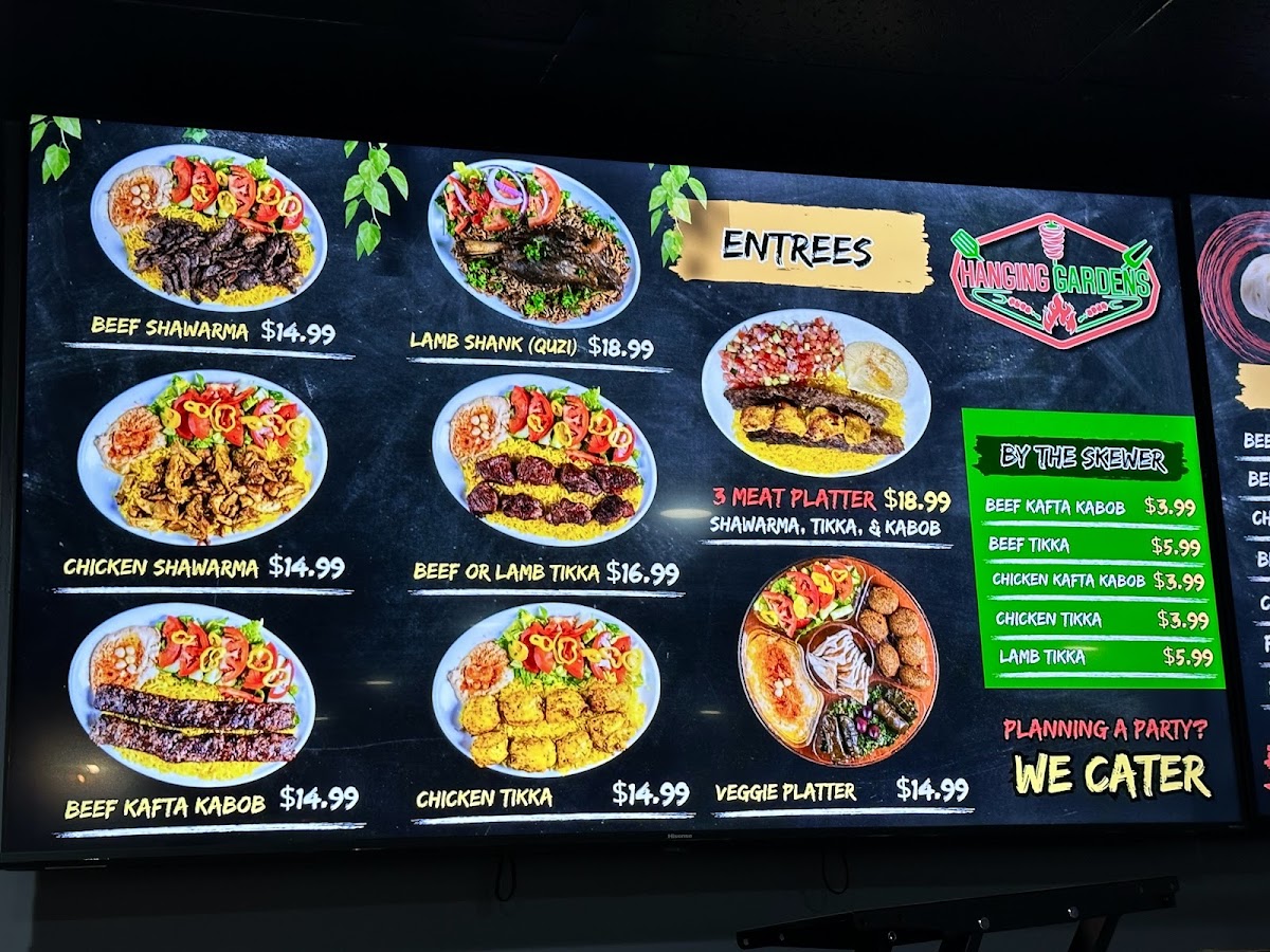 Seasoned Angus beef steaks stacked on a spindle broiler and capped with lamb fat, sliced thin and served with turmeric rice, hummus, and your choice of either garden salad or French fries. Your choice of 1 sauce included.